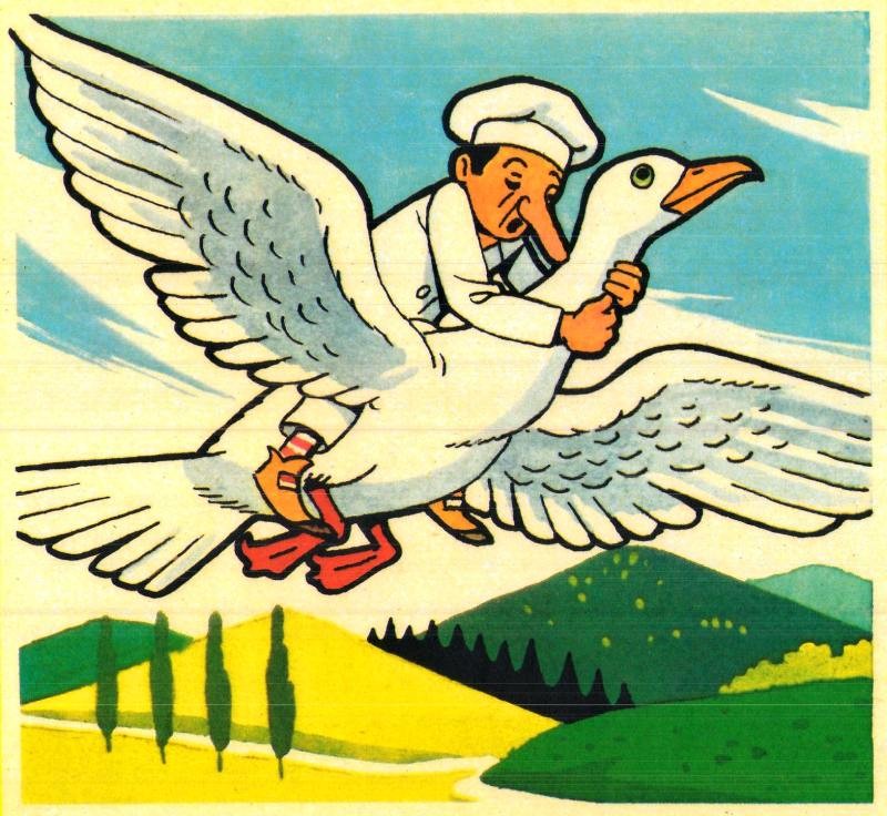„Nic dobrého nás tu oba nečeká," řekla ta husa Nosáčkovi. „Ale já vím, jak zlé odvrátit. Když mě pustíš z posady, donesu tě do báječné země, kde roste nosokoření, co ruší nosy a kde nedávají husy na pekáč."